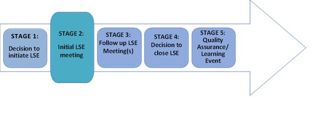 It is imperative that a meeting be held with all relevant agencies at the earliest opportunity and within five working days of the decision to progress to an LSE. The purpose of the initial meeting is to decide what action needs to be taken and by whom.